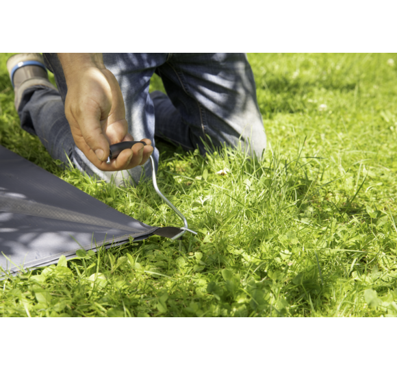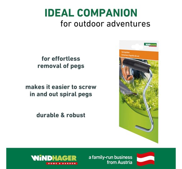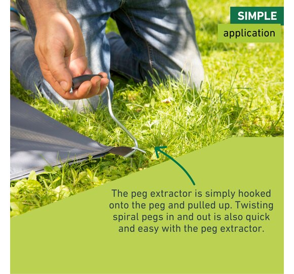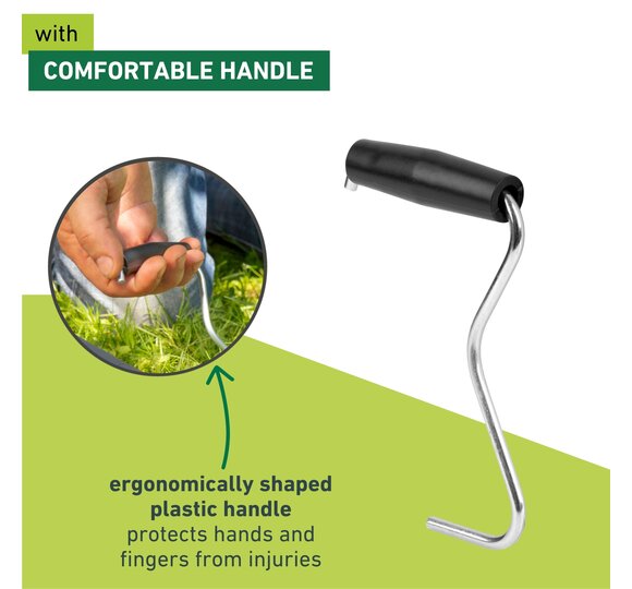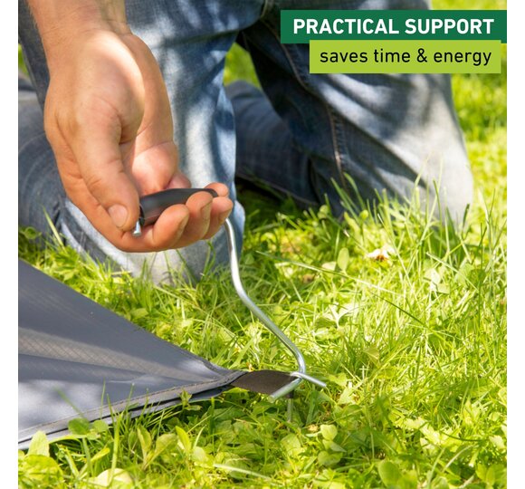 The peg extractor offers the ideal solution: the comfortable handle ensures a secure grip and the hook saves the use of force when pulling up the pegs.