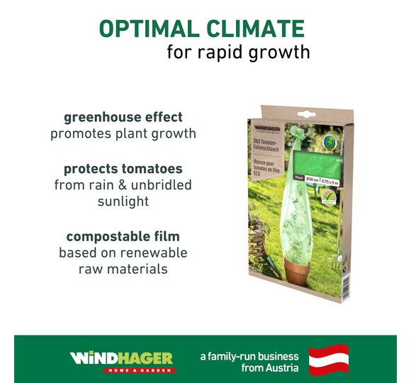 This is where the super practical Windhager tomato tube comes into play: simply unpack it, place it over the plant and the precious fruits are protected in no time. A suitable climate for growth develops under the hood, well protected but optimally ventilated thanks to the small holes in the film.