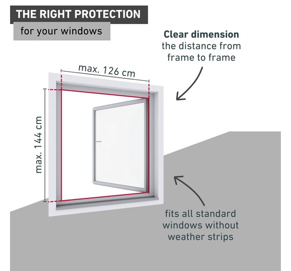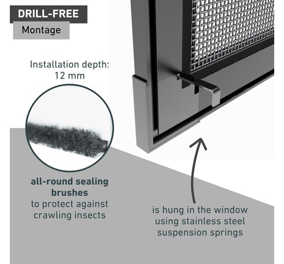 Thanks to the tear-resistant fibreglass fabric and the all-round sealing brushes, neither flying nor crawling insects will find a way into your home - the view to the outside remains unobstructed. The handle flaps make it easy for you to unhook and hook in the window, which is mounted by stainless steel hook-in springs - without having to drill!