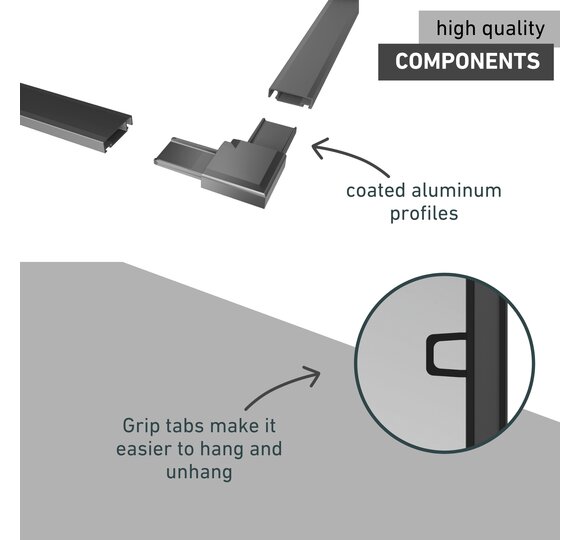 - HIGH QUALITY COMPONENTS - coated aluminium profiles, robust fibreglass fabric, circumferential sealing brushes and facilitating handle flaps.