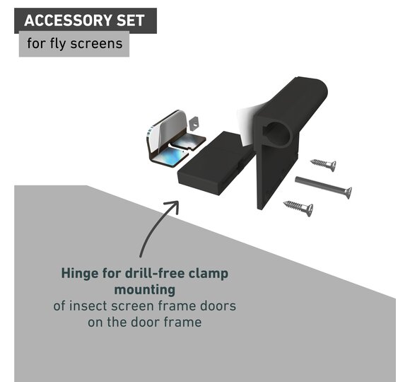 - Hinge for drill-less clamping installation of EXPER framed door screen on door frame