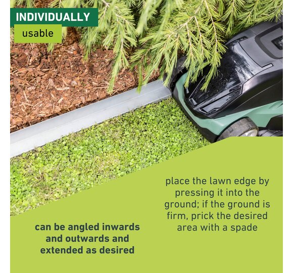 The mowing edge is placed simply by pressing it into the ground. On firmer ground, it is advisable to prick the desired area with a spade. Depending on requirements, the mowing edge can be angled inwards and outwards and extended as required. This means that nothing stands in the way of personalising the design of your own garden.
