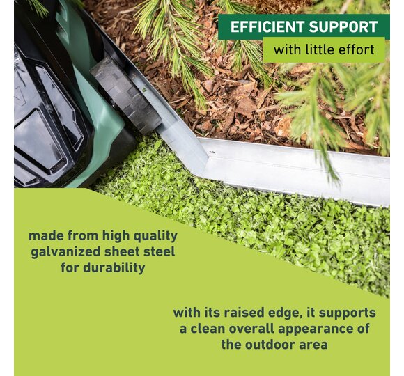 With the EASYCUT mowing edge, the dream of a well-tended garden becomes reality. It is ideal for separating lawns, flowerbeds and walkways and, with its raised edge, supports a clean overall appearance of the outdoor area. High-quality galvanised sheet steel prevents the mowing edge from rusting under the influence of bad weather, ensuring a long service life.