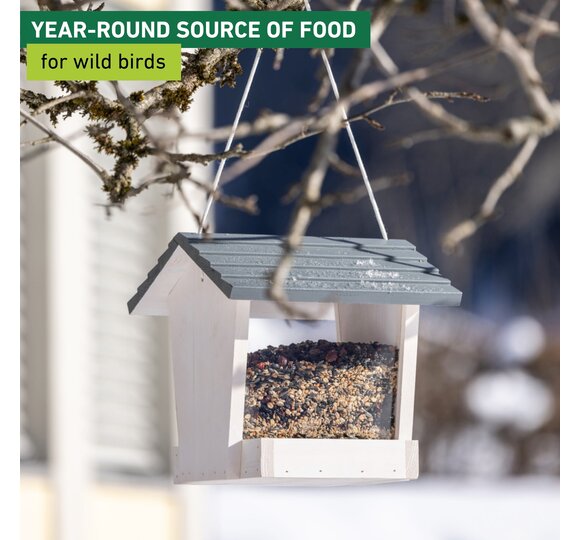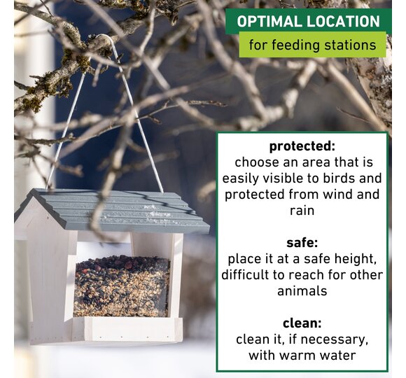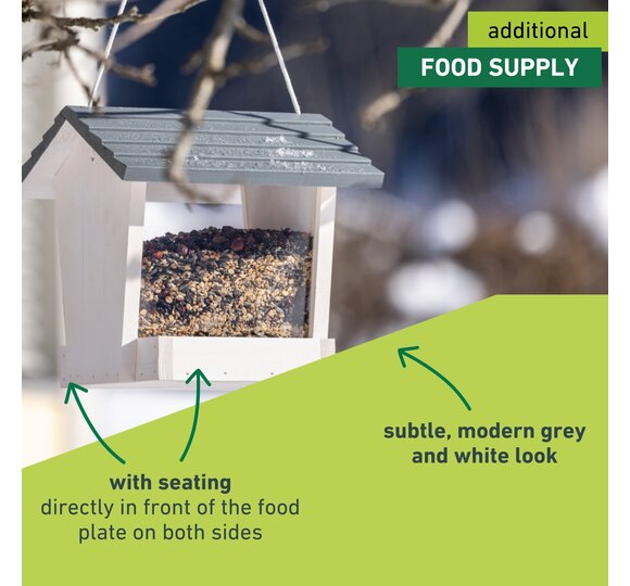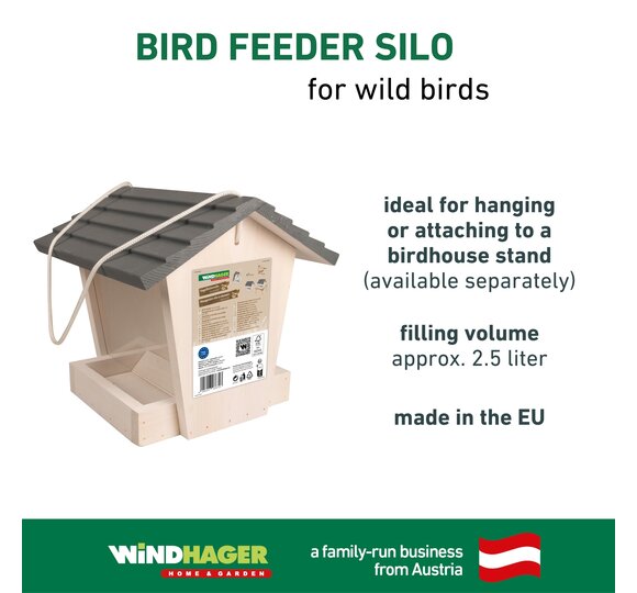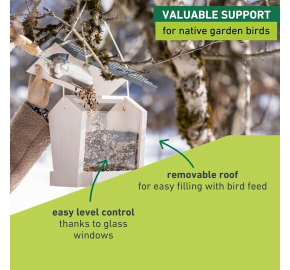 The Karwendel bird feeder silo can become a popular landing place for birds. Feeding bases at the sides invite birds to linger and peck away at the food. The feeder is very simple to fill through the removable roof. A quick glance through the glass panel is all that is needed to check the feed level. The birdhouse can either be hung up or placed in a secure location once a suitable place has been found.