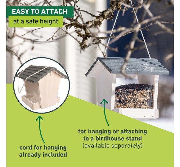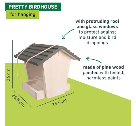 - PRETTY HANDING BIRDHOUSE – This bird feeder silo made from light pine wood can be used all year round as a source of food for native birds.