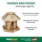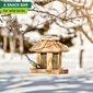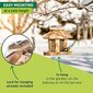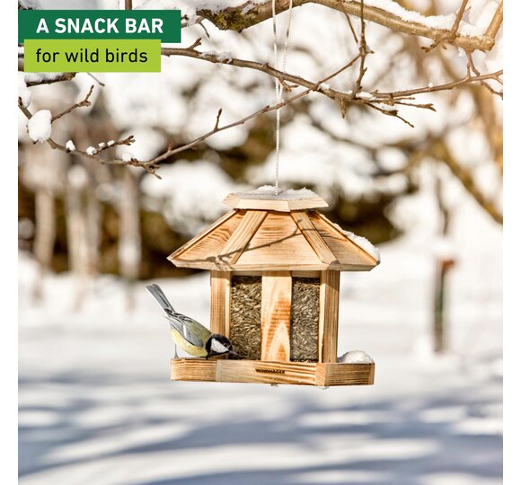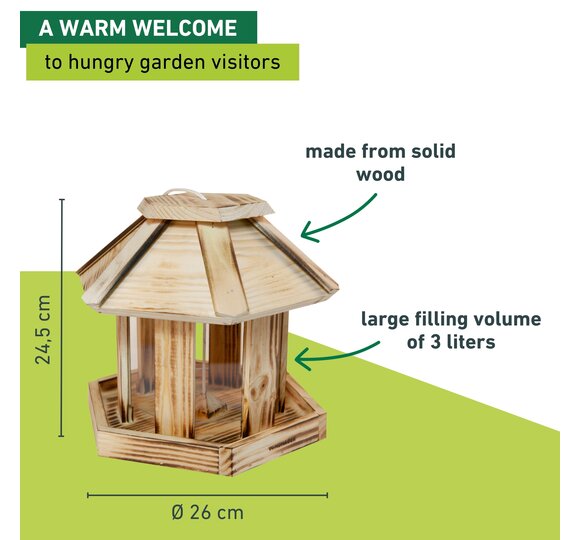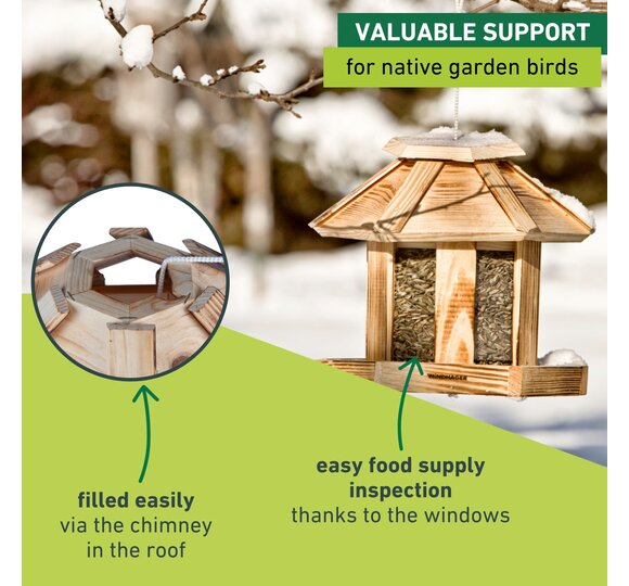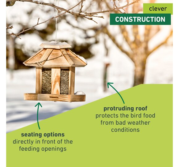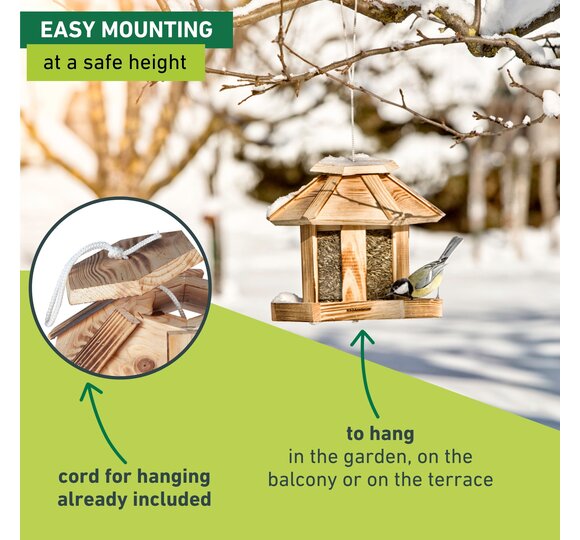 Filled with suitable bird food through the detachable roof. Ideal for the birds are, among others, ready-made grain mixes, sun flower seeds, oats, poppy seeds, hemp and linseeds. The bird feeder is equipped with a handy suspension cord to facilitate installation.