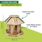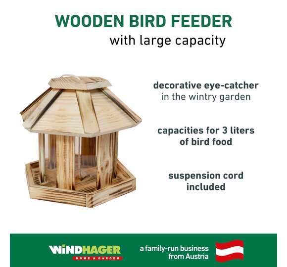 Blackbirds and common chiffchaffs are friendly and welcome guests. This bird feeder is made from weatherproof solid wood and stands out with its planed, mottled look. Its outstanding feature is its hygienic silo construction. Glass windows on both sides allow for easy food supply inspection. The product was made in and its raw materials sourced from the EU.