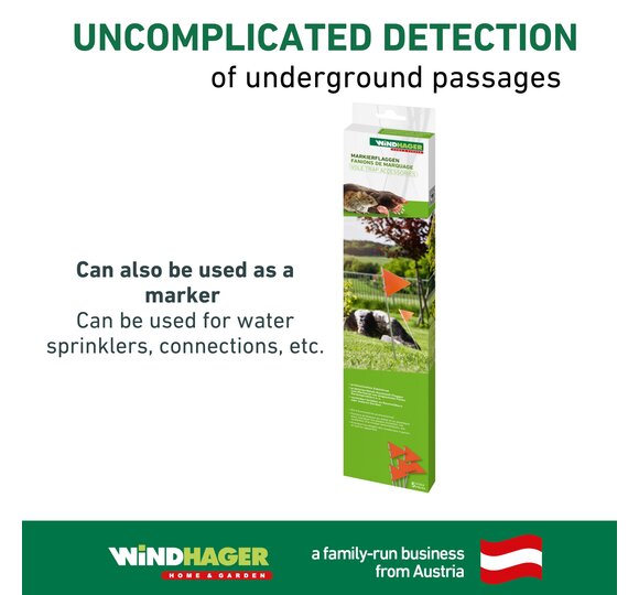 If the garden is inhabited by moles and voles, it can be very annoying. Fortunately, with the traps of Windhager, molehills and bitten roots will soon be a thing of the past. The search for underground tunnels to choose where to set the traps is not that easy without the right tools. Thanks to the combination of marker flags and the separately available set of sounding rod and cutter (item no. 05316), tracking down corridors is a piece of cake. The practical marker flags can also be used for other purposes, such as marking water sprinklers or connections.