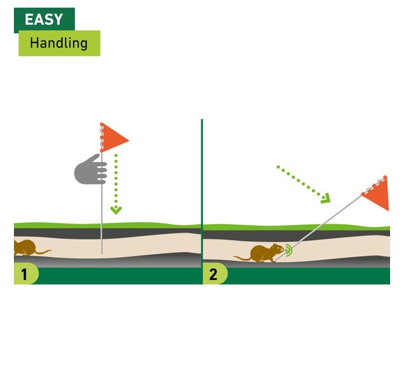 Use the Windhager VOLE TRAP ACCESSORIES sounding rod (item no. 05316) to dig into the ground where tunnels are expected. If no resistance can be felt, it is probably one of the branched passages. This is where the marker flags come into play. Simply mark the spots with the help of the flags wherever no resistance can be perceived. If these are in the grass a few hours later, this means that the tunnel is inhabited and frequented. Traps should be positioned precisely in these spots.