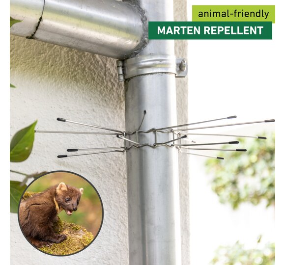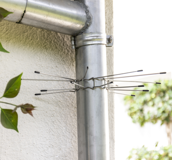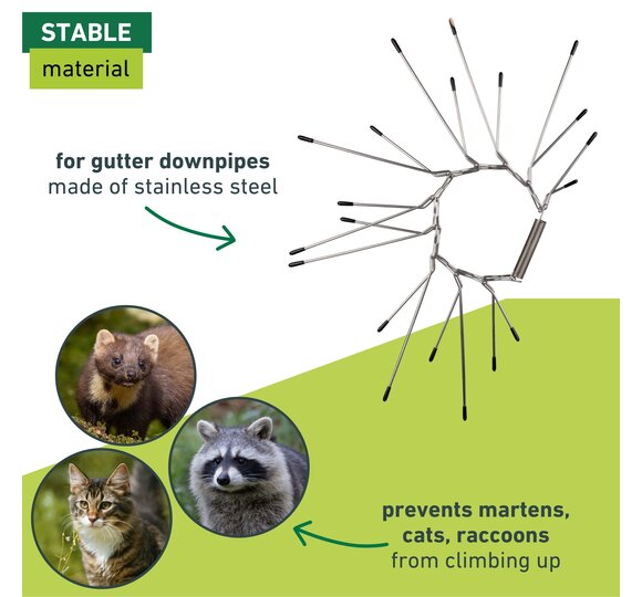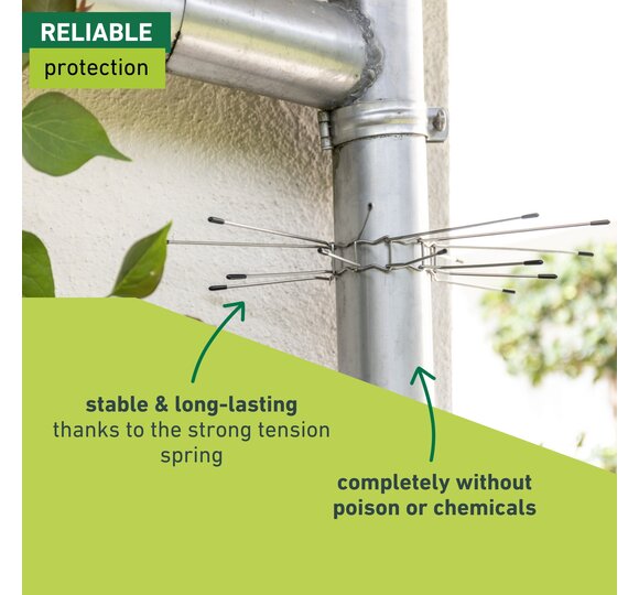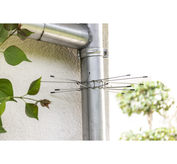 Martens and dormice living in the attic are unpopular guests that can cause great damage. The clever climbers often find their way onto the roof via downpipes and gutters. A special defence ring for downpipes prevents the rodents from climbing up. The individual belt links are plugged together and can thus be adapted to a downpipe diameter of up to 10 cm. A strong tension spring ensures a stable, long-lasting hold. The pointed stainless steel defence spikes are fitted with protective caps so as not to injure animals or humans.