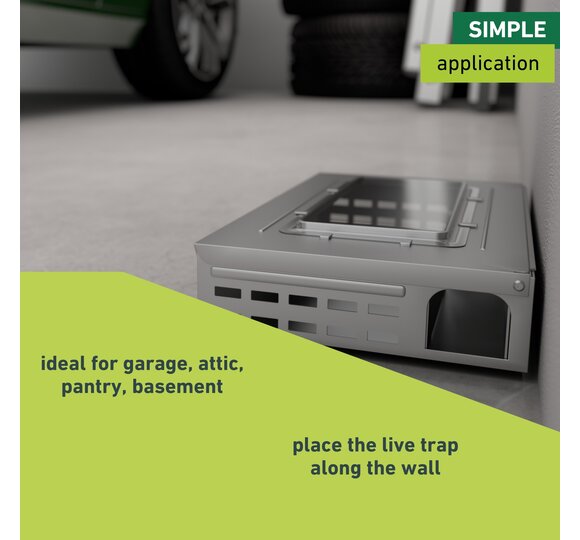 Easy to use: this practical mousetrap has a hinged lid. This makes baiting, emptying and cleaning the trap a breeze. It can be easily placed along the wall in the garage, attic, pantry or basement.