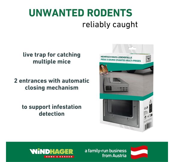 Mice and rats in the house, attic or shed are a real nuisance. Not only unpleasant, but also very unhygienic. There are various ways to get rid of them. Ultrasonic devices that also work against martens, classic mousetraps or animal-friendly live traps. With Windhager products for combating mice and rats, you can return to your rooms completely relaxed.