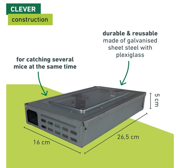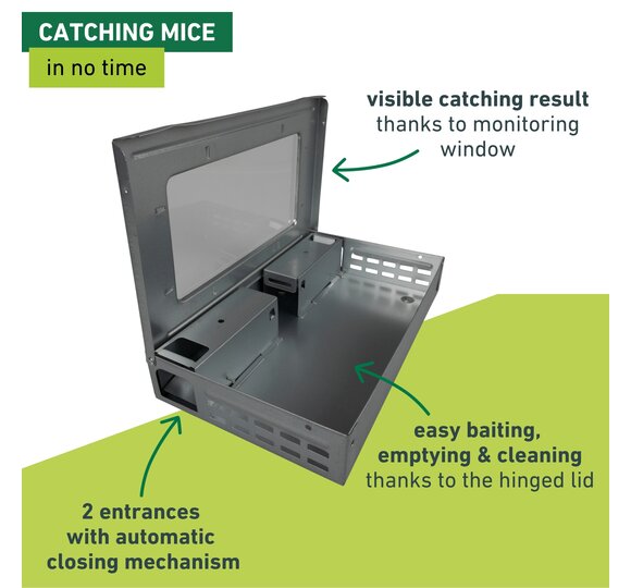 Made of galvanised steel, this durable mousetrap can catch several mice at once. The two entrances on either side of the trap have an automatic closing mechanism that prevents trapped mice from escaping. The monitoring window makes it easy to check if there are already mice in the trap. This not only helps to identify the infestation, but also allows you to quickly release the small rodents back into the wild at a suitable location.