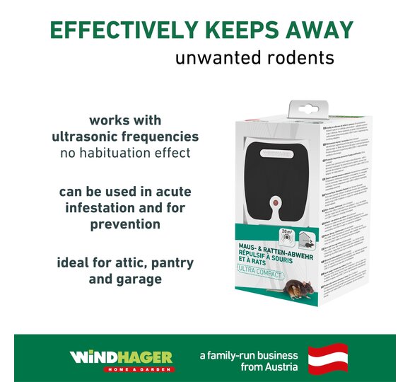 Mice and rats in the house, attic or shed are a real nuisance. Not only unpleasant, but also very unhygienic. There are various ways to get rid of them. Ultrasonic devices that also work against martens, classic mousetraps or animal-friendly live traps. With Windhager products for combating mice and rats, you can return to your rooms completely relaxed.