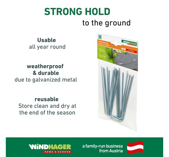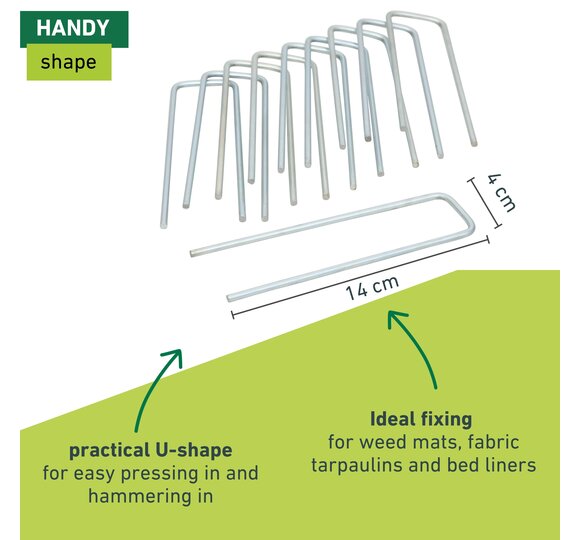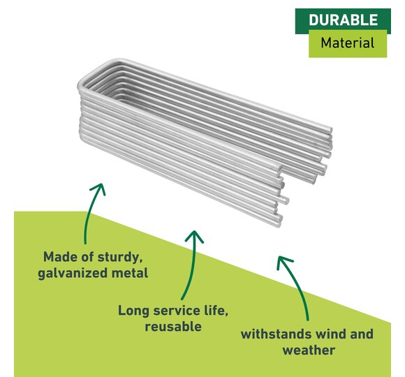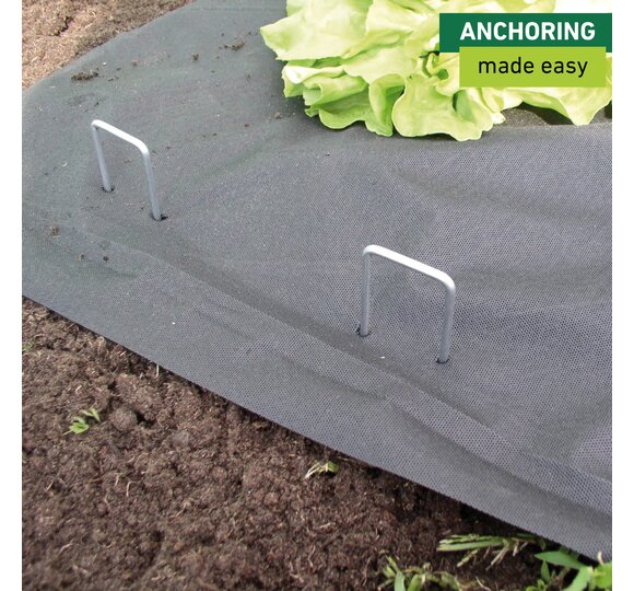Made of galvanized metal for securely fastening fleeces and plastic sheeting in the soil.