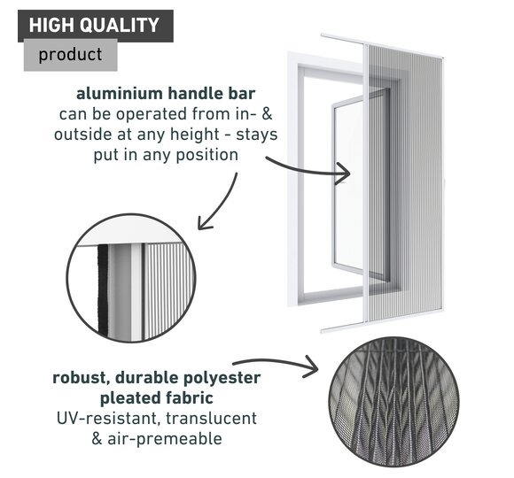 - COMPLETE CONSTRUCTION IN PLISSEE OPTICS - Sturdy frame made of powder-coated aluminium profiles. Robust, durable polyester pleated fabric, UV-resistant, light- and air-permeable. Sealing brushes for optimum sealing.