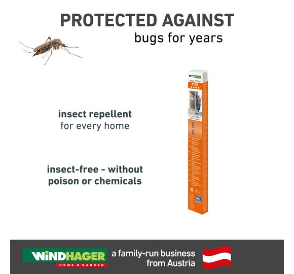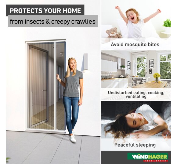 The Windhager insect screen pleated door PLUS is a space-saving solution for single-leaf balcony and patio doors. It can be conveniently pushed open and closed and stopped in any position. All parts are made of powder-coated aluminium, the matt finish provides a noble look. The fabric in a modern pleated look keeps mosquitoes out, but lets fresh air and daylight into the living rooms. The glued-on sealing brushes block even the smallest insects from getting inside.