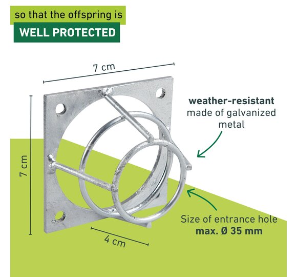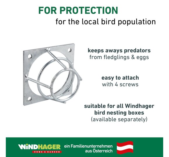 Well-placed nesting boxes provide domestic birds with a safe place to breed. A well thought-out protection frame protects the eggs and fledglings. The sturdy metal frame (approx. 7 x 7 cm) is attached to the box in front of the entrance hole by means of four screws; it can also be retrofitted to nesting boxes that are already set up but uninhabited. Thanks to its tapering shape nest predators such as cats, martens or larger birds can no longer reach the fledglings. This nest predator protection is suitable for all Windhager bird nesting boxes.