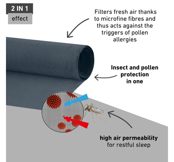 The fabric offers better visibility and higher air permeability than conventional anti-pollen fabrics. It filters fresh air by means of micro fibres and thus effectively keeps the causes for pollen allergy out.