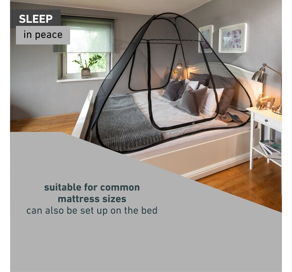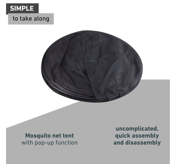 With the reliable mosquito net tent, you can let your children play outside without having to treat itchy insect bites later. Or you can set up the tent directly on the bed and enjoy undisturbed nights. The mosquito tent is available in three different sizes to fit all standard mattress sizes. Thanks to the practical pop-up function, you can take it with you everywhere in the practical bag (e.g. on your next holiday).