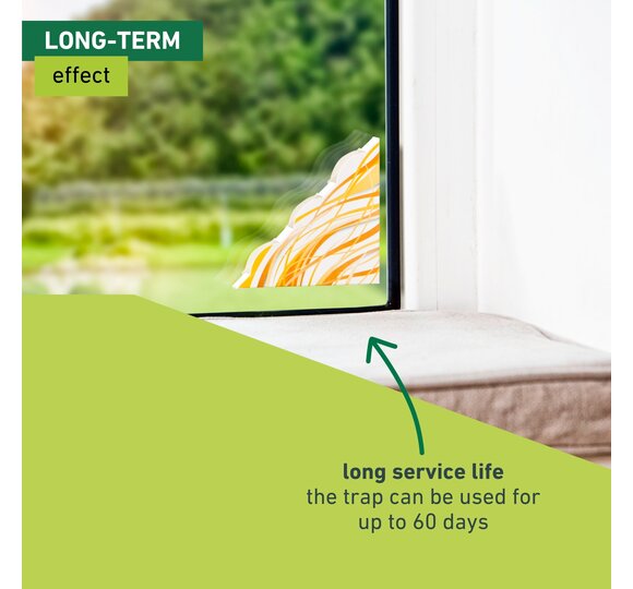 This discrete and – above all – hygienic trap keeps your home free from flies 24/7. Depending on the number of flies and interior temperature, the odourless glue trap lasts up to 60 days. Easily attached to the corner of a window or a balcony door’s glass pane thanks to pre-manufactured double-sided adhesive strip.