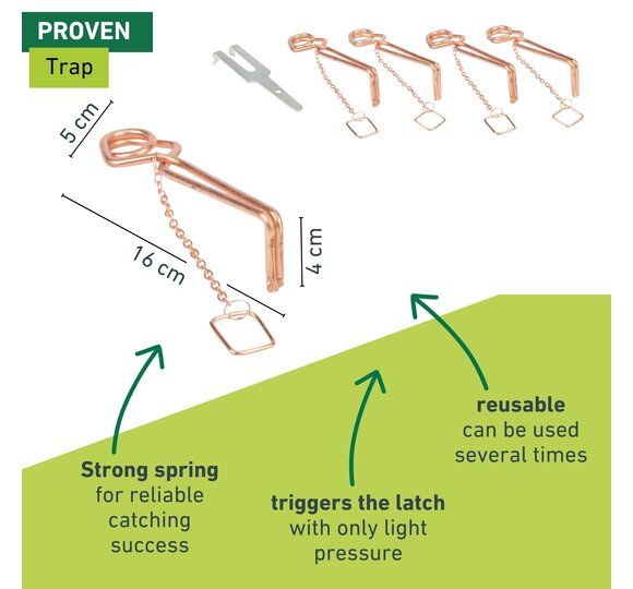 Voles are undesirable guests in the garden - they not only devastate the lawn, but can also ruin the vegetable harvest. Put an end to it all with the proven SUPER STRONG vole trap. With this high-quality and durable trap with a particularly strong spring, you can catch voles effectively and reliably. The trap is triggered by a slight pressure. After a successful catch, the vole trap can be immediately used again thanks to the reusable plates.