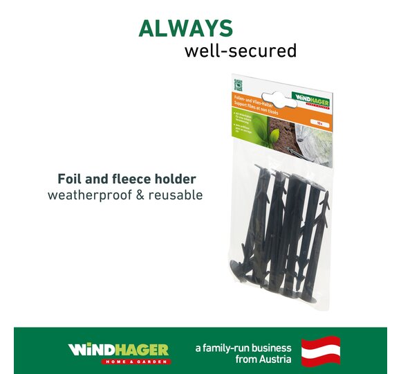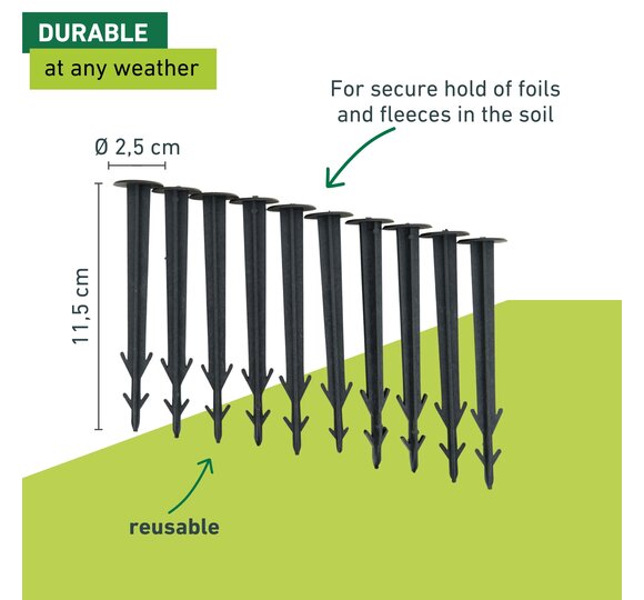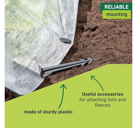 Simple fastening solutions for films and fabrics ensure secure fixation in the ground. Plant stakes prevent direct contact with nets and plants, protecting them from damage, while pegs firmly anchor weed mats, tarps, and nets in the soil.