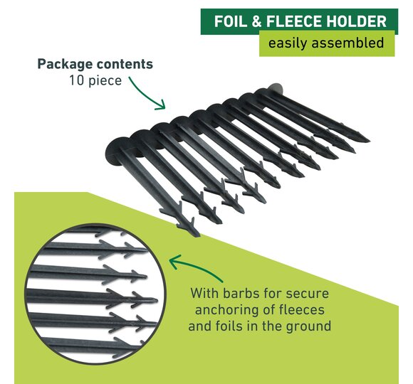 Plastic stakes with barbs for securely anchoring fleeces and plastic sheeting in the soil.