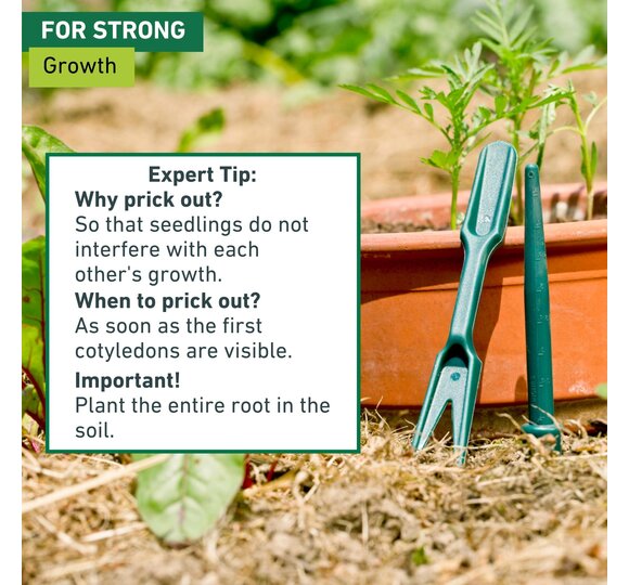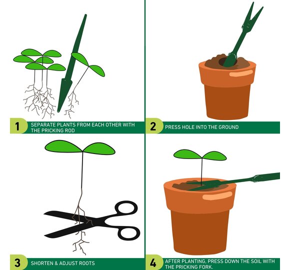 The plants are first separated from each other using the dibber and then a hole is pressed in the earth. When the young plant has been planted, the hole around the plant is carefully covered with earth and made firm.