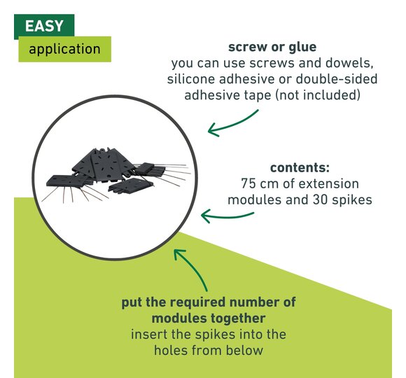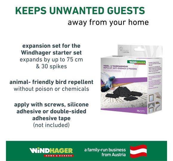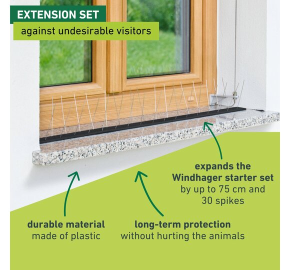 - EXTENSION SET FOR EVEN MORE PROTECTION - This set expands the Windhager bird & pigeon repellent by up to 75 cm and 30 spikes.