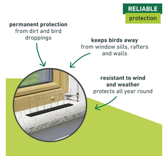 - BIRD PROTECTION FOR WINDOW SILLS AND CO - The spikes keep pigeons and other birds away from window sills, rafters or walls.