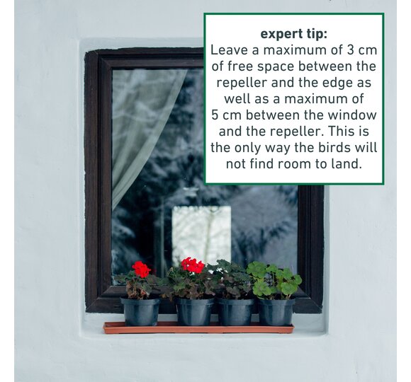 Put together as many modules as you need for your window sill and close the last module with the enclosed end piece. Then insert the spikes into the prefabricated holes from below. There should be no more than 3 cm of free space between the defence and the (windowsill) edge. You can leave a gap of 5 cm between the window and the defence. This is the only way the birds will not find room to land. Two or more sets can be placed on a wide surface, with max. 8 cm distance.