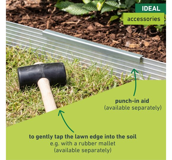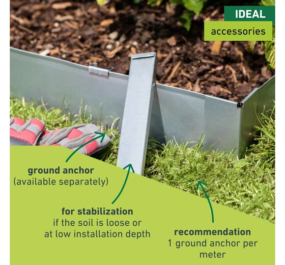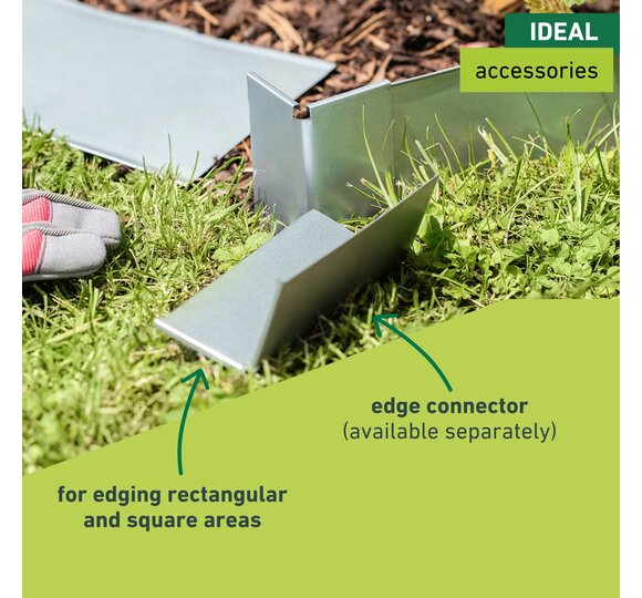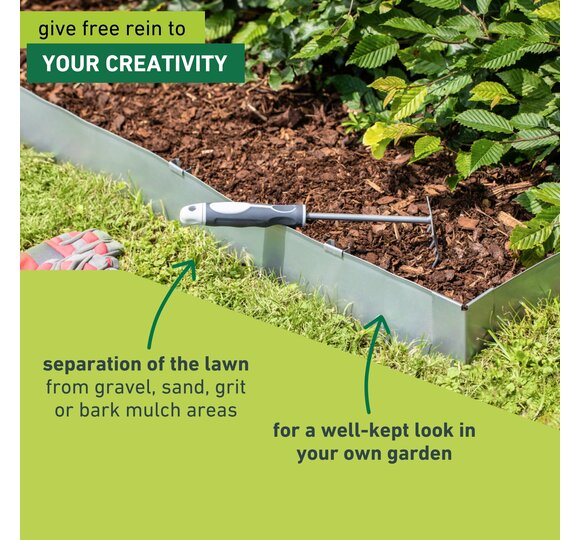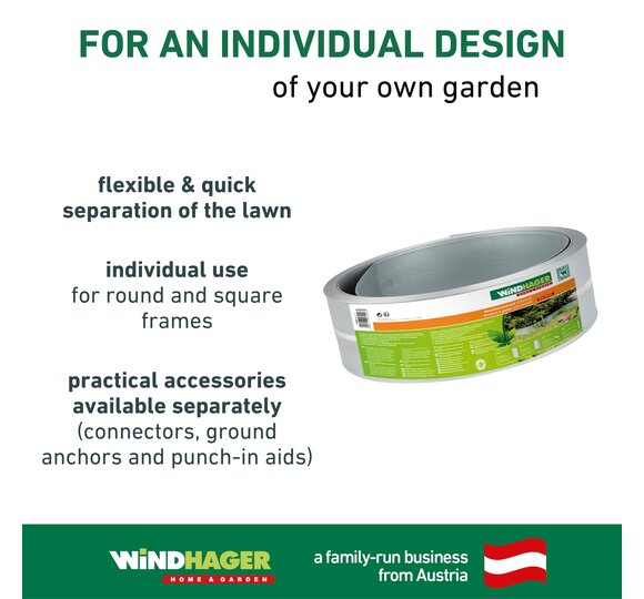 This long-lasting and sturdy lawn edge strip allows you to quickly and easily separate your lawn from gravel, sand, grit or bark mulch areas. The Windhager lawn edge strip can be inserted into the ground for up to 5m without using connectors. Its high-quality galvanized metal provides a high degree of flexibility and design freedom while also making it sturdy and long-lasting. Handy accessories such as connectors, ground anchors and punch-in aids make inserting and shaping it easier.