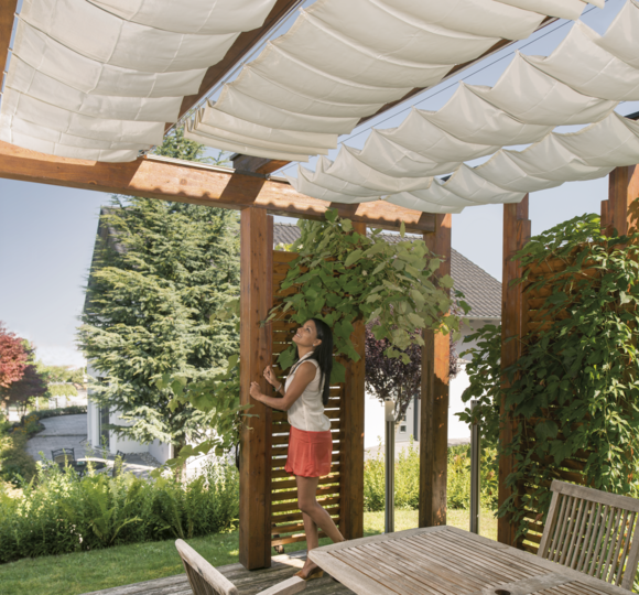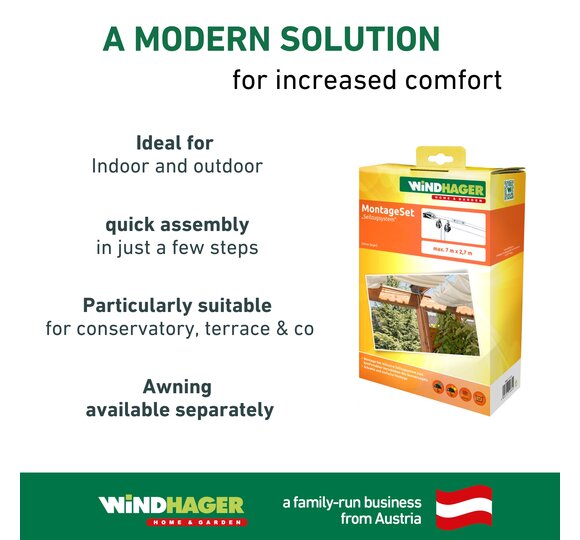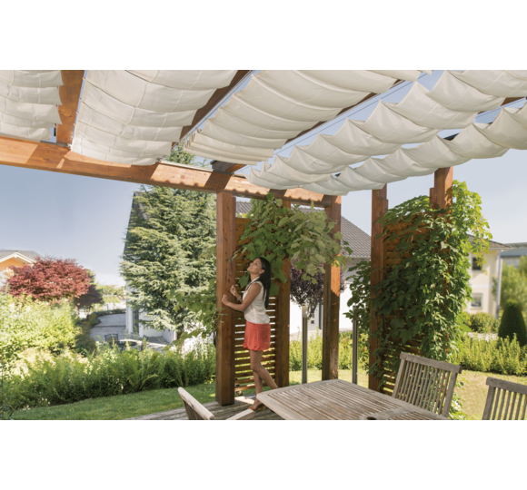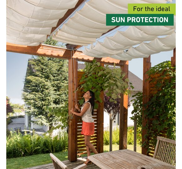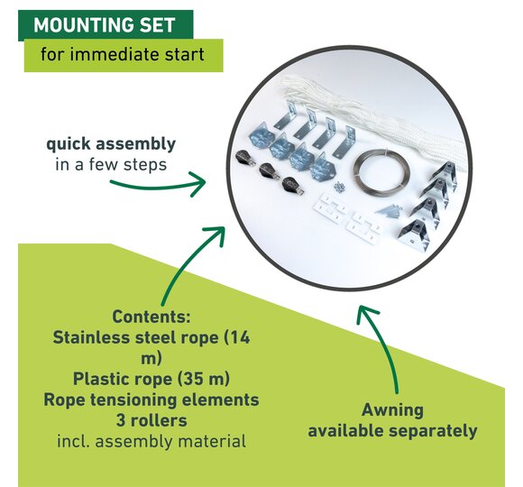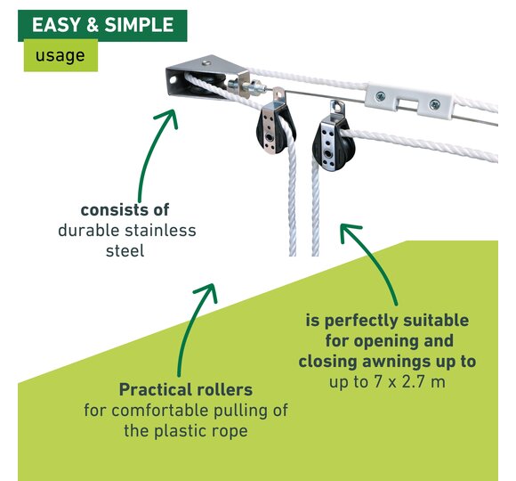 Rope-pull system for putting up awnings up to 7 x 2.7 m.