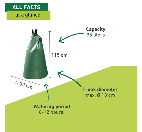 • available in 2 versions: 56 litres (max. trunk diameter 15 cm, irrigation period 3 - 5 hours) and 95 litres (max. trunk diameter 18 cm, irrigation period 8 - 12 hours)
