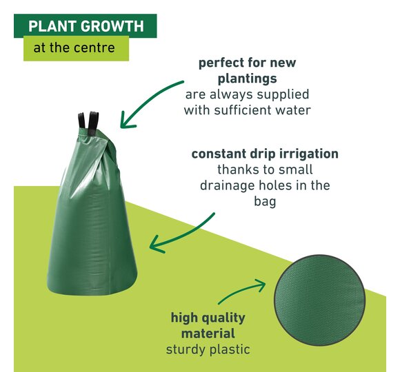 Irrigation plays a crucial role in the healthy and successful growth of the tree. Especially freshly planted trees benefit from optimum care. If too much water is added to the soil too quickly all at once, there is a risk that it will run off at the surface and not even soak through to the roots. Drip irrigation via drainage holes in the bag, on the other hand, irrigates the soil very slowly and constantly for hours: in the 56 litre version for 3-5 hours, in the 95 litre version for 8-12 hours. This enables a more effective way to care for your plant.