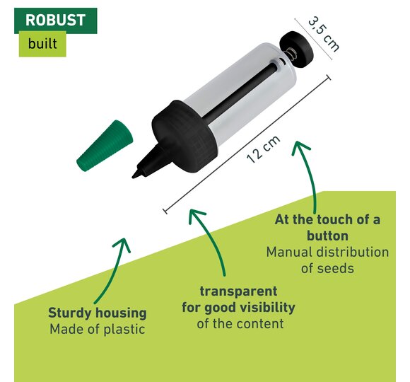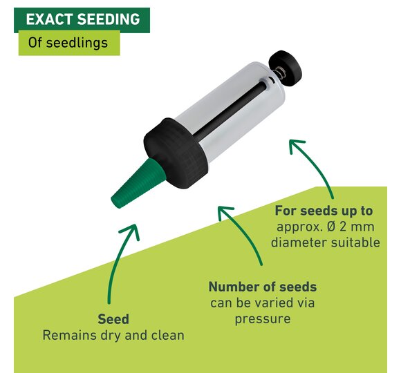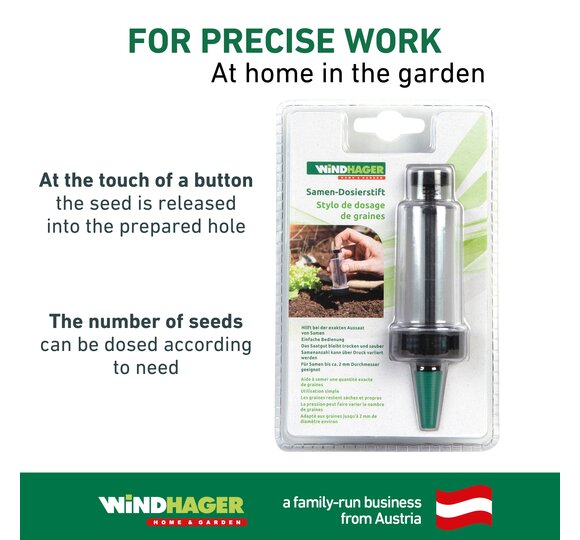 When distributing seeds by hand, it is sometimes hard to use the right amount. If it then does happen, that you do use too many seeds, then the densely positioned young plants have to be carefully picked apart. The seed dispensing pen from Windhager makes exact dispensing as easy as pie. You can make the right-sized hole in the ground, with the tip, before pressing the dispensing button to propel the seed into the ground. The number of seeds can also be changed depending on how much pressure you use. This pen guarantees a quick and easy seed.