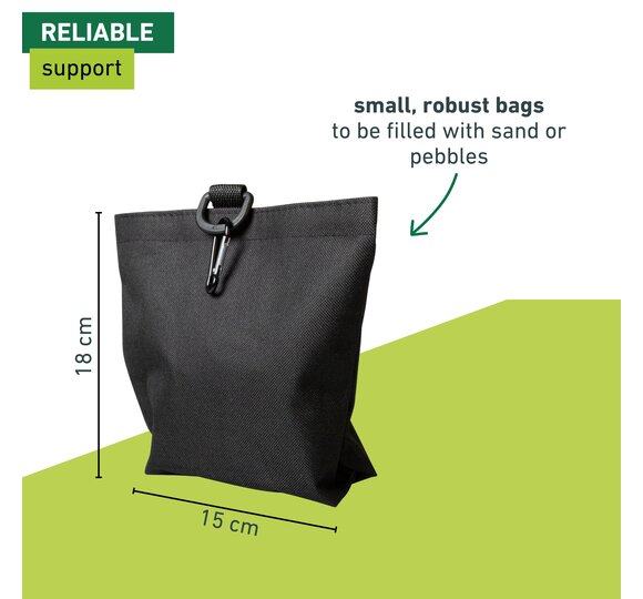 Simply fill the inner bag with sand or pebbles (approx. 2 kg per bag) and close it effortlessly with the zip fastener. The outer bag is made of particularly hard-wearing fabric and can be opened at any time using the Velcro fastener. The practical snap hook also offers flexible fastening options. Without filling, the MINI sandbags can be stowed away compactly.