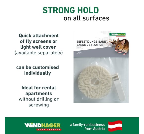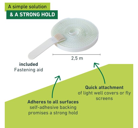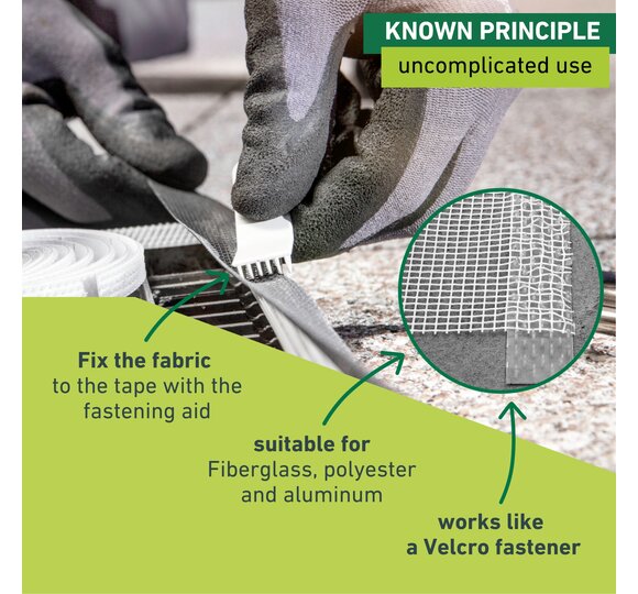 For the fast and hassle-free attachment of fly screens to window frames - works just like a velcro fastener. Suitable for fibreglass and polyester fabric alike.