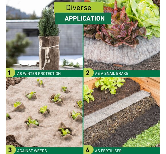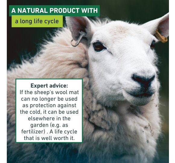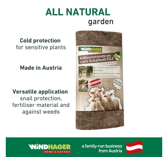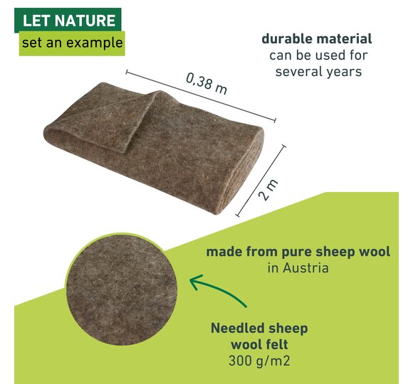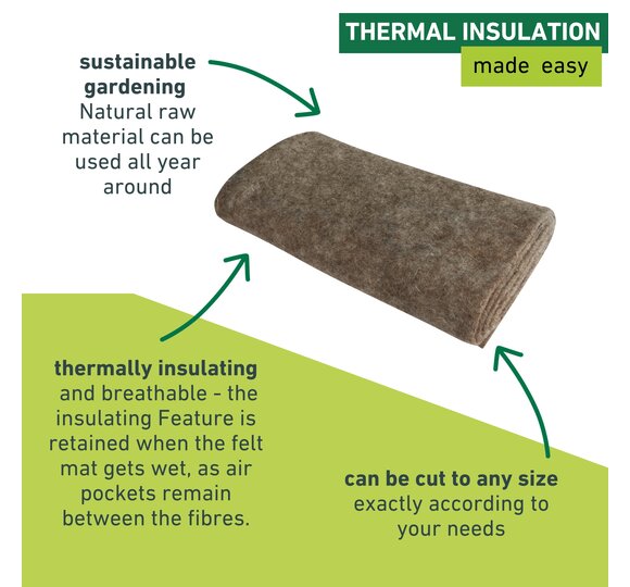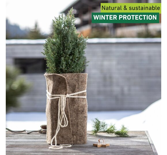 The high-quality sheet made from tightly woven sheep's wool felt reliably protects shrubs, potted plants and trees from cold temperatures, frost and wind. Sheep's wool is a renewable and natural raw material that possesses the ideal heat insulating properties and is extremely breathable - the felt sheet retains its insulating properties, even when wet, as air pockets still remain between the fibres. Made in Austria.