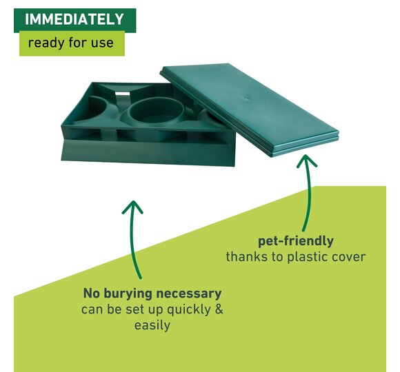 The trap can be set up in any chosen location and can be easily filled, emptied and cleaned via the foldable lid. Compact measurements.