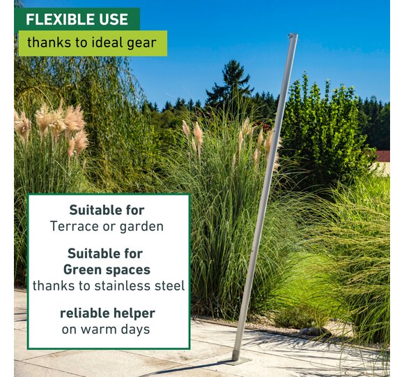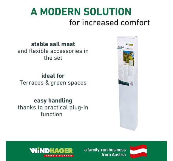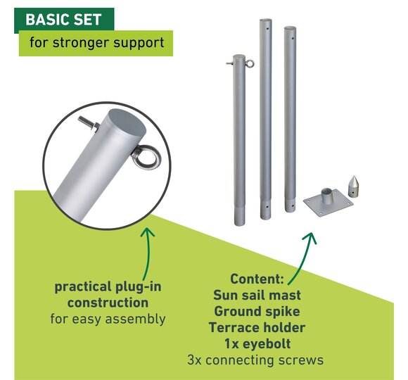 The sun sail pole kit "Basic" is your perfect 2-in-1 solution for patios and lawns. Thanks to the included patio mount and ground spike you can fasten it to the patio or lawn. Its handy plug-type design makes it easy to assemble and ideal for all those who want to be able to set their sun sail up quickly and individually.