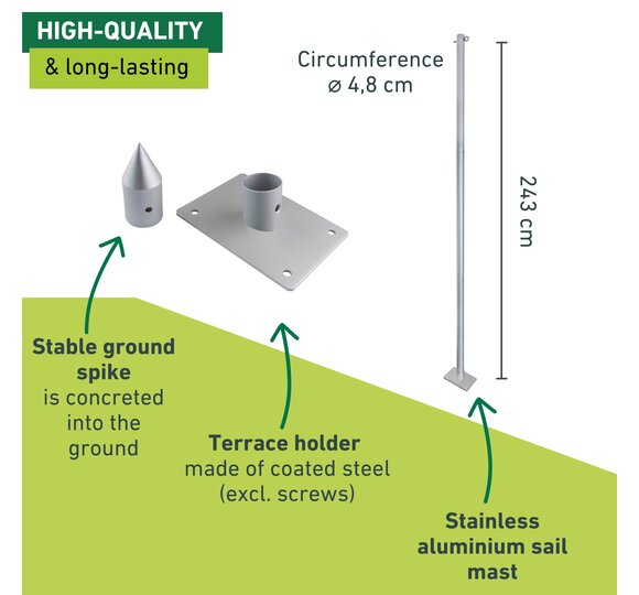 - CORROSION-FREE SAIL POLE – Made of aluminium, pole height 240 cm