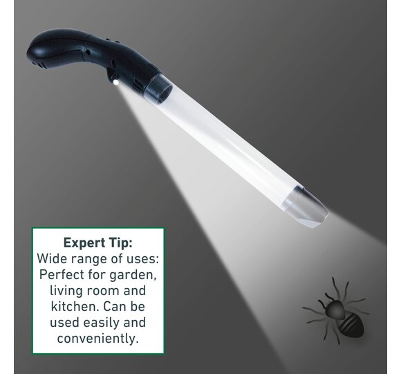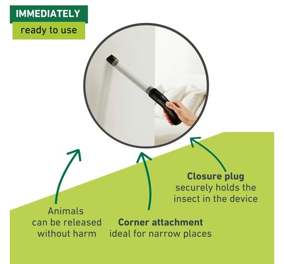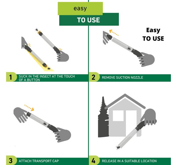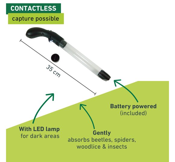 Place the suction pipe close to the insects and press the suction button. Whoever feels uneasy can close the pipe with a cap and only open this again to the open air. An integrated LED light makes the capture of the insects in dark areas easier.