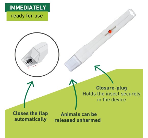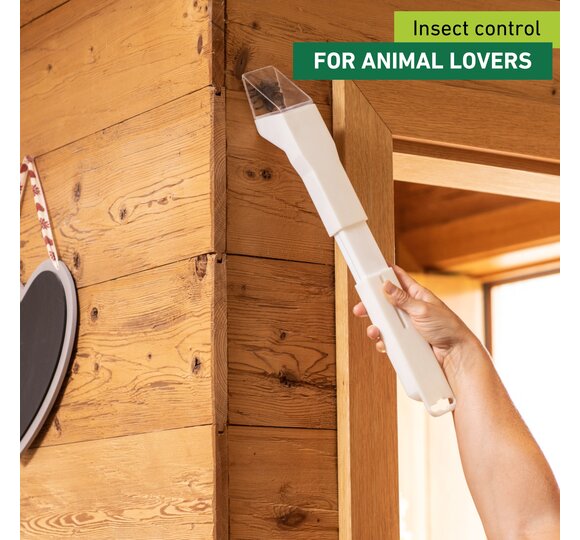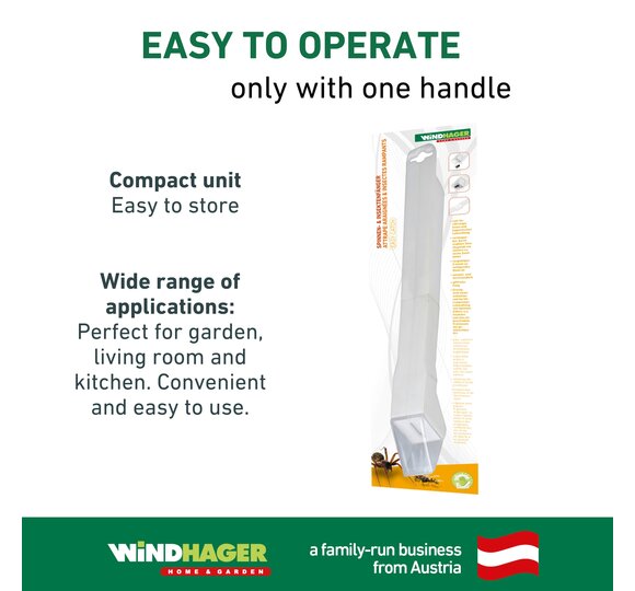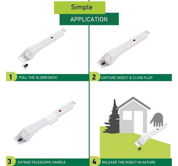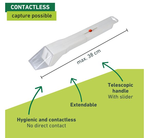 Do spiders and other insects keep getting lost in your home? The EASYCATCH spider and insect catcher offers quick and uncomplicated help. You can catch the insects from a safe distance and release them again unharmed at a suitable place. Releasing the insects is also contactless and hygienic. The telescopic handle allows you to keep a safe distance from the insects - up to 35 cm. The flap is operated by a slider on the handle, so no batteries are needed.