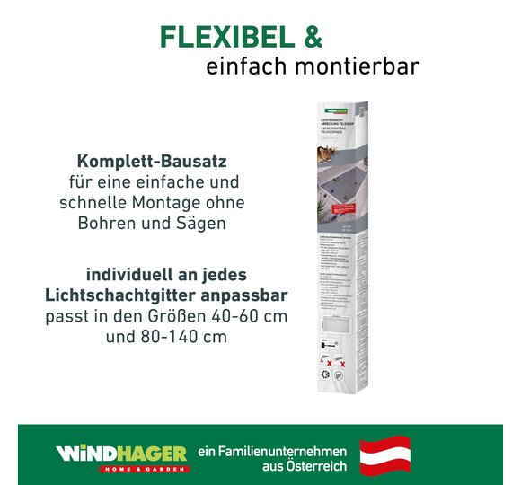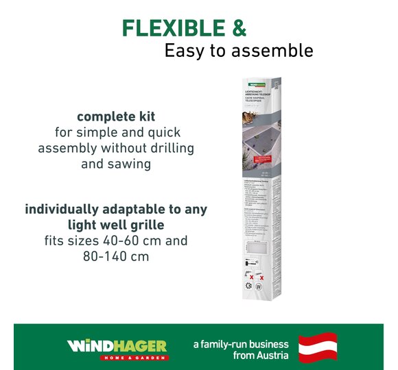 Cover frames for light wells not only keep out leaves, stones and coarse dirt. They also ensure that no animals get lost in the cellar shaft and possibly enter the house. The telescopic light well cover from Windhager has another plus point: you do not have to reach for a saw to cut the frame profiles. They can simply be extended or pushed together to the desired size.
