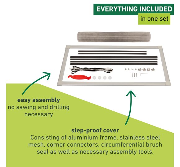 - ALL-IN-ONE - Aluminium frame, stainless steel mesh, corner connectors and brush seal