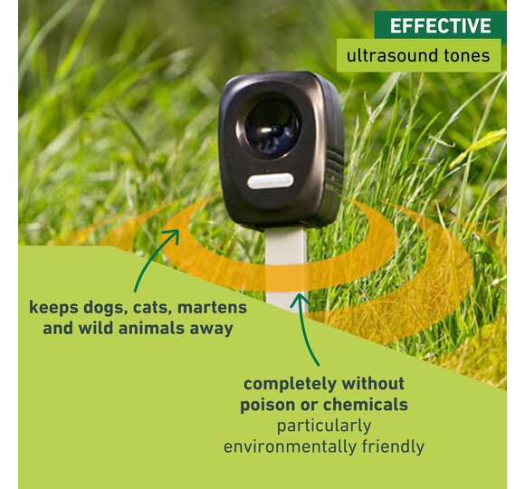 The low-frequency ultrasound waves that are distributed in a wave-like way are barely audible to the human ear, yet pests such as cats, dogs and martens find them extremely jarring and take flight quickly. The repeller reduces damage, noise and odours caused by animals marking their territory and wild animals to a minimum – a must-have for all garden owners.