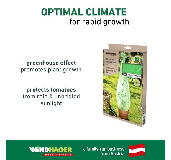 This is where the super practical Windhager tomato tube comes into play: simply unpack it, place it over the plant and the precious fruits are protected in no time. A suitable climate for growth develops under the hood, well protected but optimally ventilated thanks to the small holes in the film.
