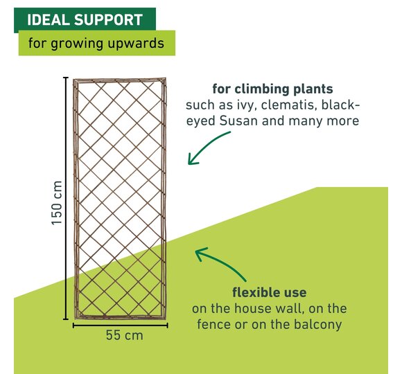 Whether on the house wall, fence or balcony: the versatile trellis, made from natural willow, always cuts a fine figure. It offers climbing plants such as ivy or clematis an ideal area to grow upwards, making it an attractive eye-catcher in its location. Densely overgrown, this natural climbing aid also proves to be an attractive privacy shield for gardens and patios, providing more privacy and security.